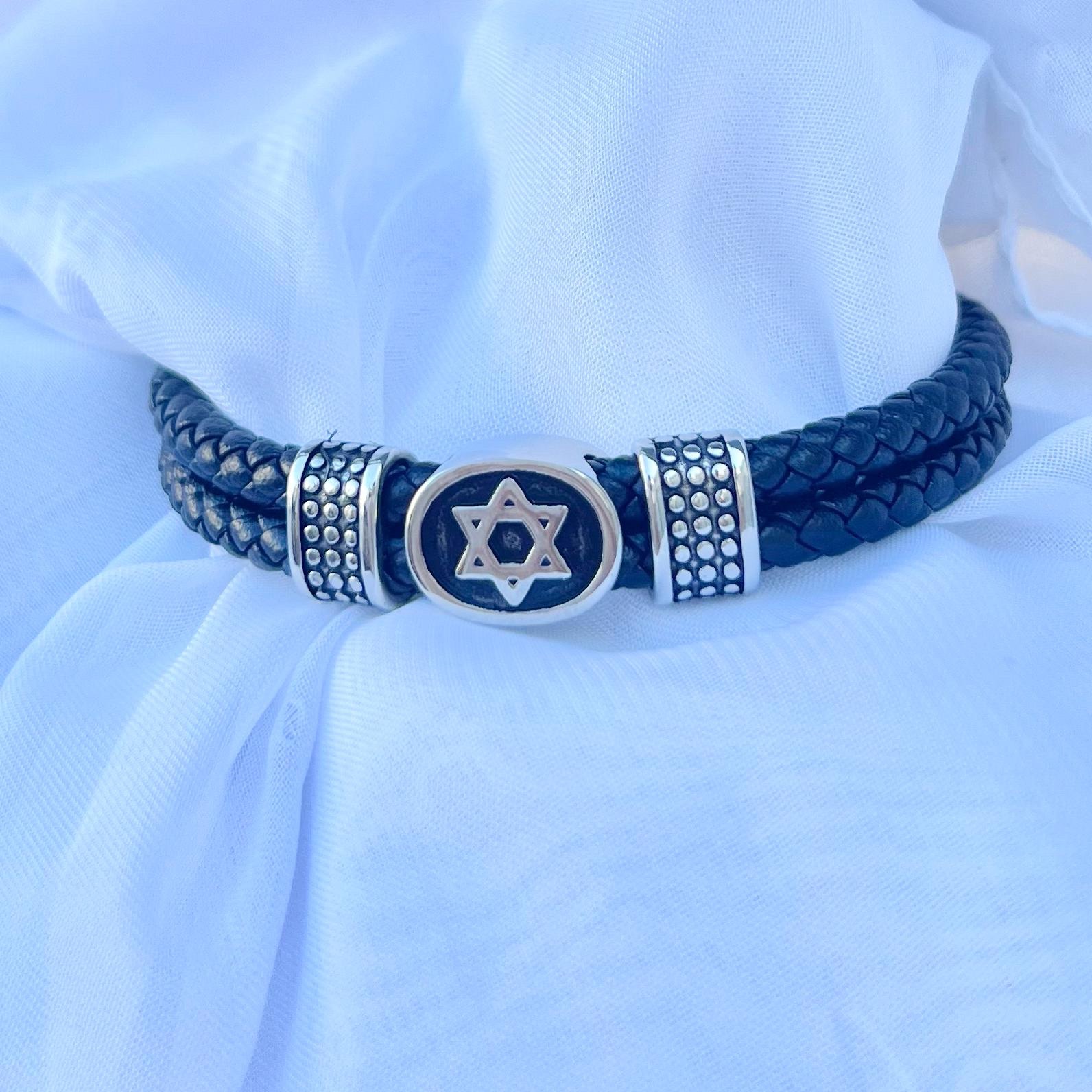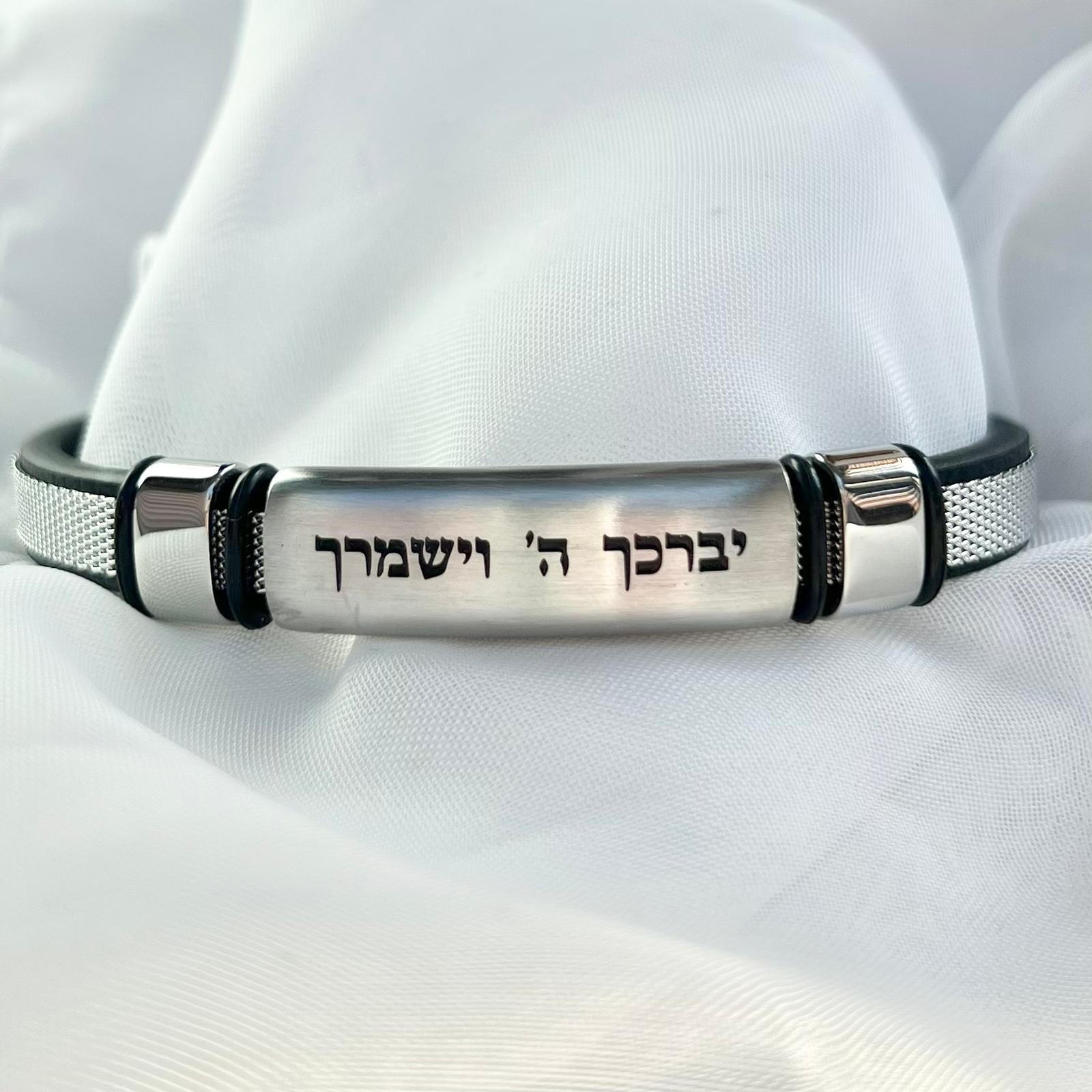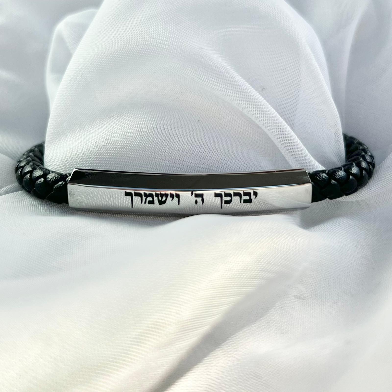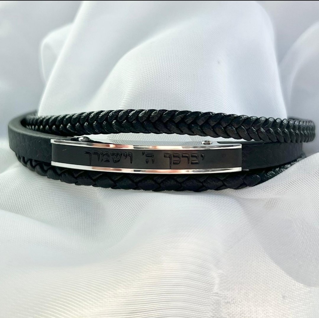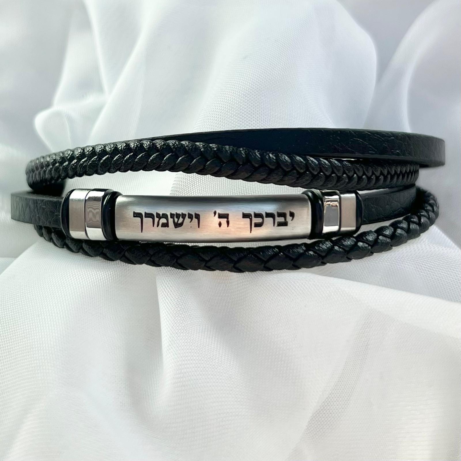 צמיד לגבר בעל 3 שורות עור עם פלטת חריטה שחורה יברכךה’וישמרך עשוי מסטנסטיל אל חלד