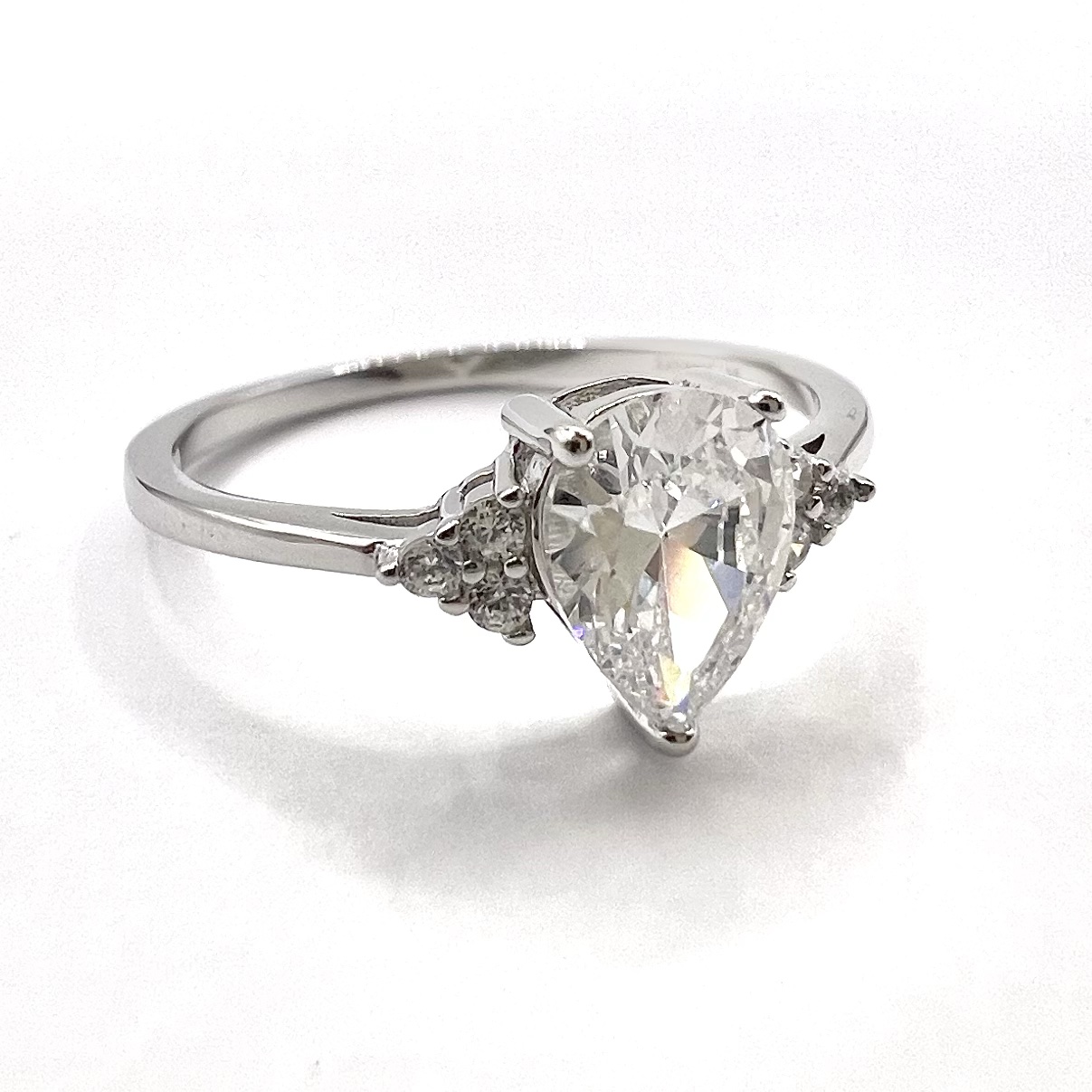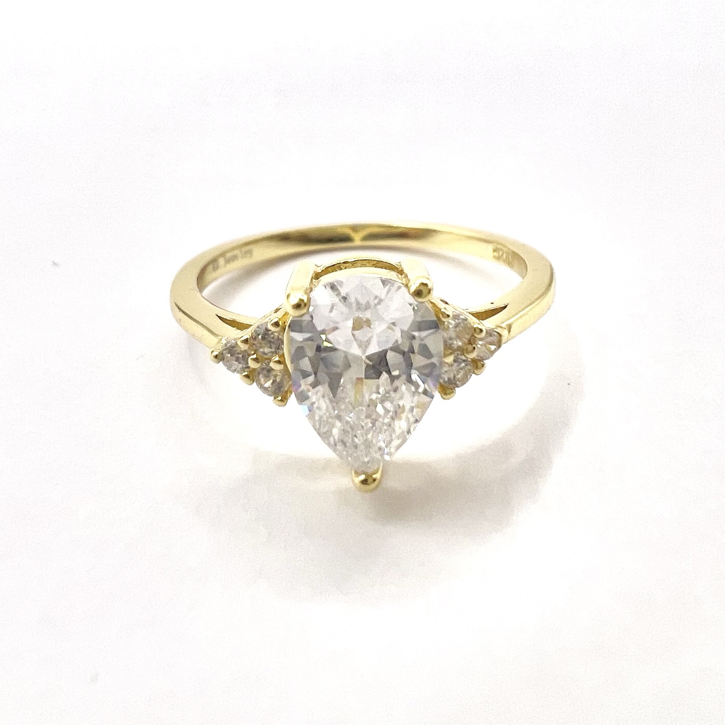 טבעת חלקה משובצת אבן זרקון גדולה בצורת טיפה עם שלושה אבני זרקון קטנות מכל צד