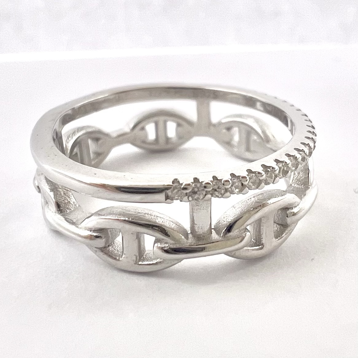 טבעת כפולה בצד אחד בעיצוב אליפסה עם קו באמצע ובצד שני טבעת משובצת אבני זרקון מכסף אמיתי 925
