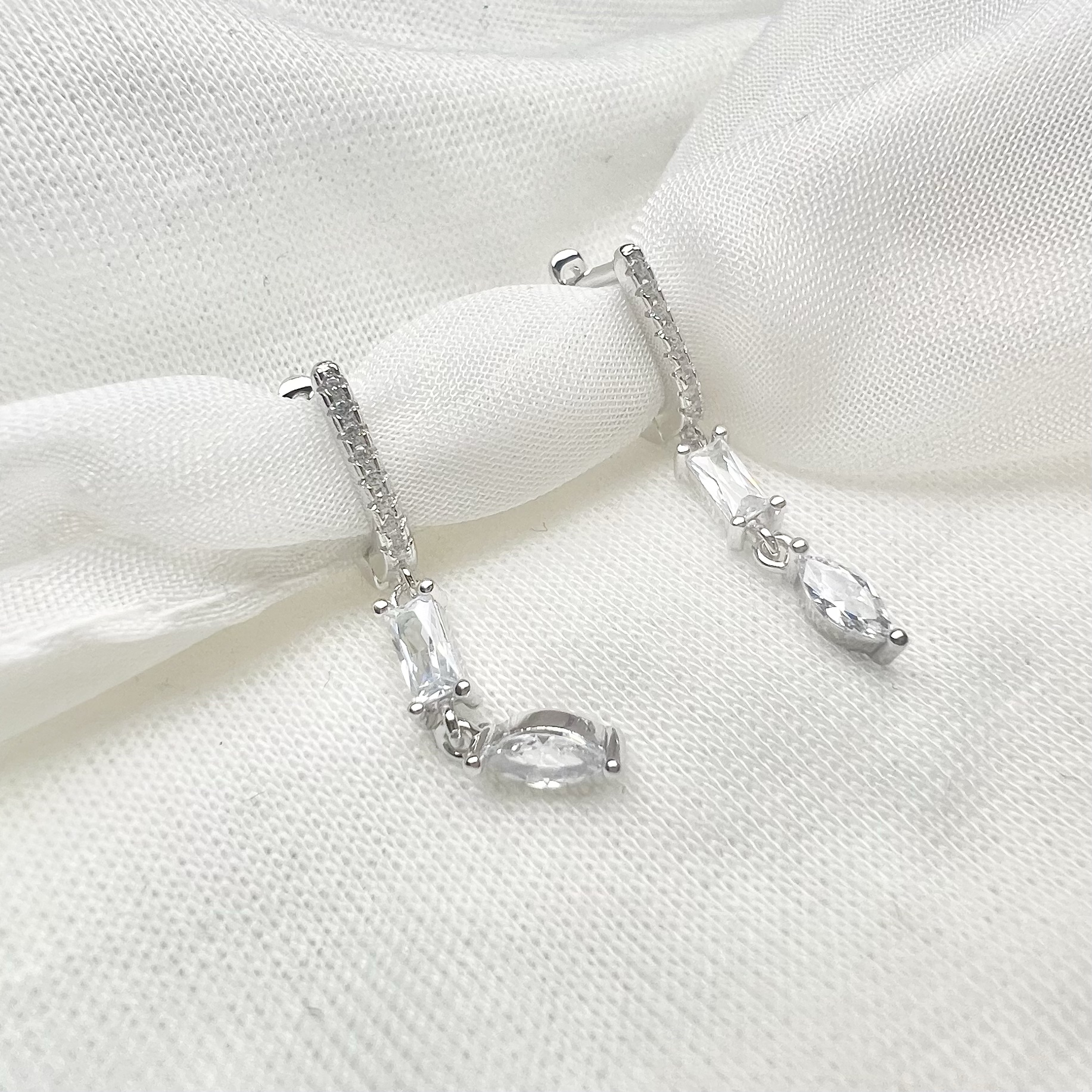 עגיל חישוק משובץ אבני זרקון עם אבן זרקון מרובעת נופלת שאליה מחובר עוד אבן בצורת טיפה מכסף אמיתי 925