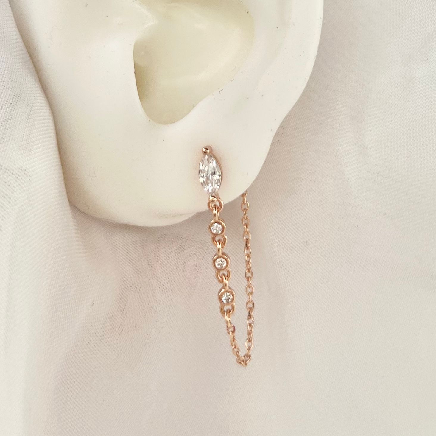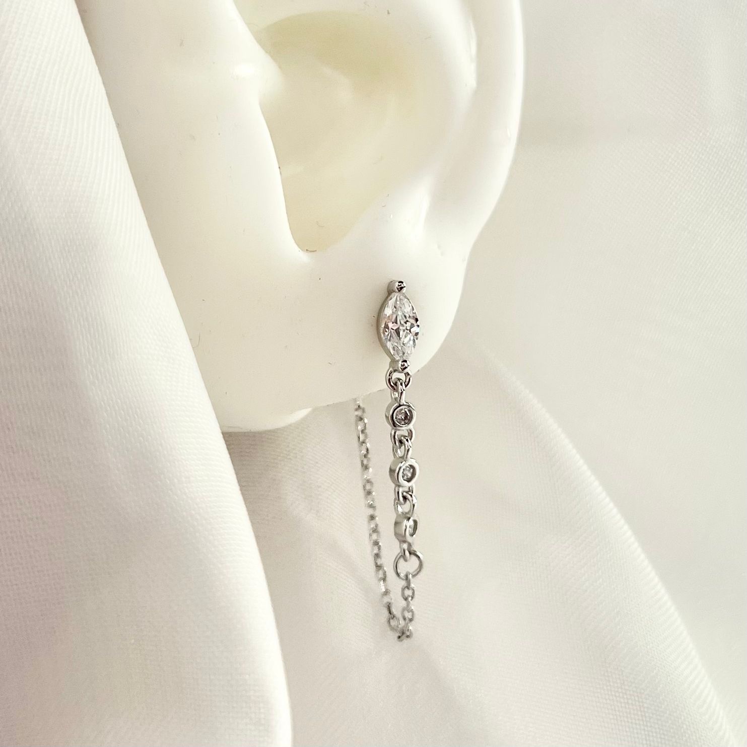 עגיל צמוד עם אבן זרקון בצורת טיפה שמחוברת לשורת אבני זרקון עגולות נופלות מכסף אמיתי 925