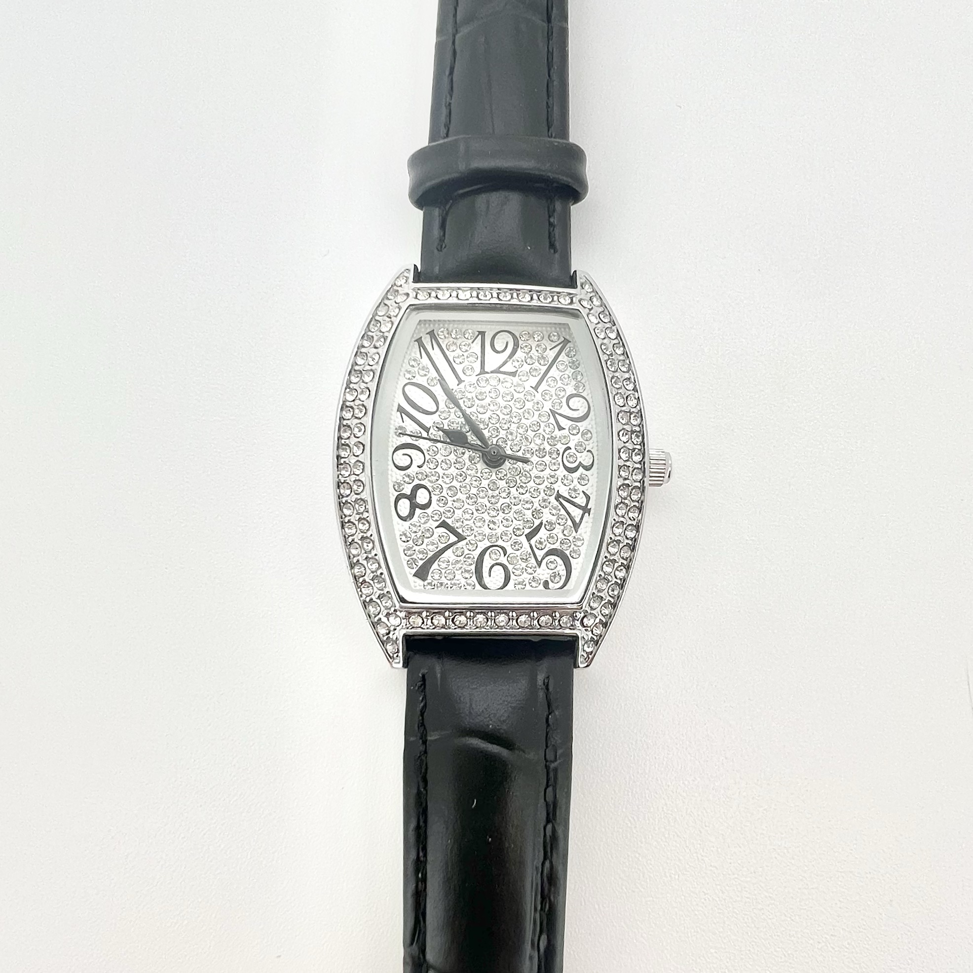 שעון משובץ אבני זרקון בתוך השעון ומסביבו מחובר לרצועת עור