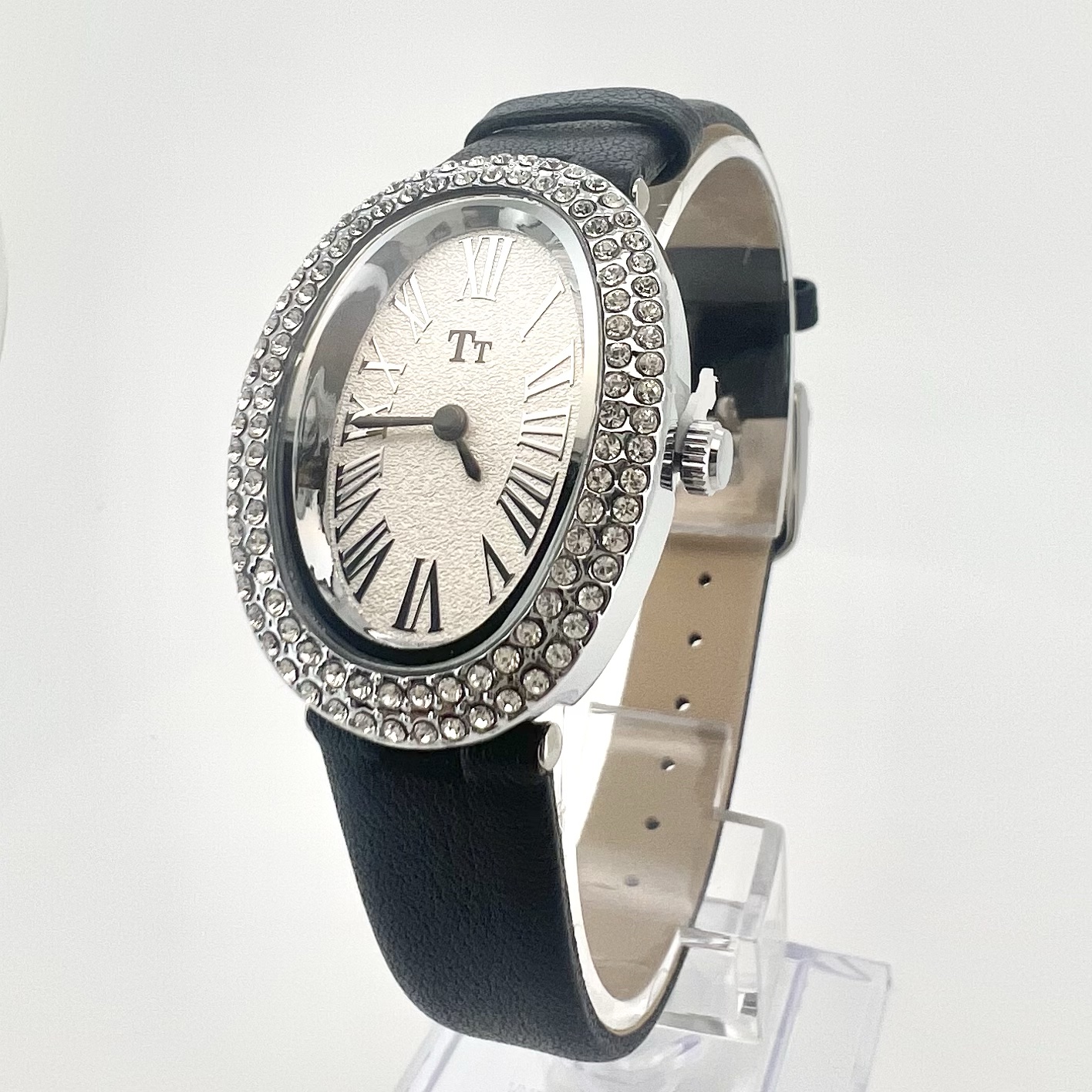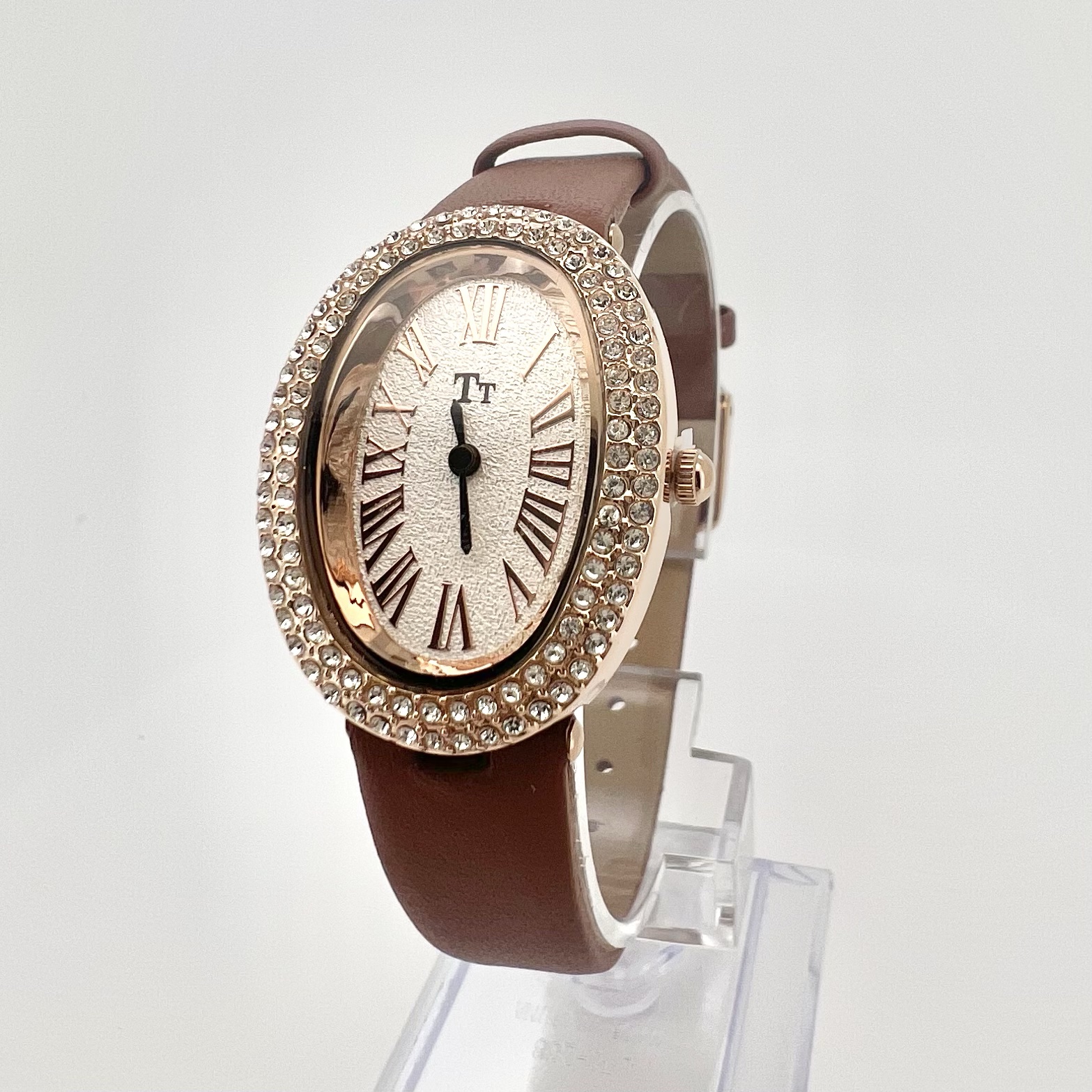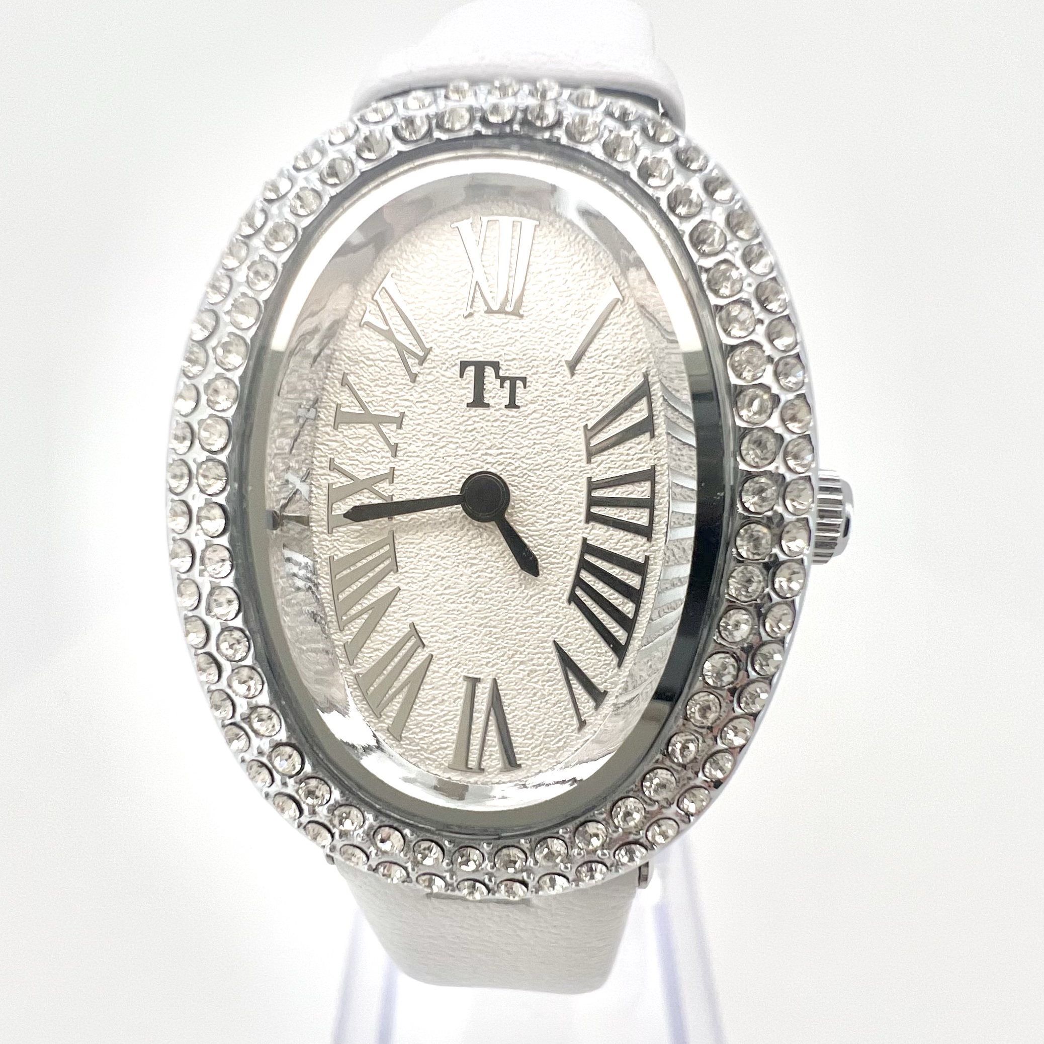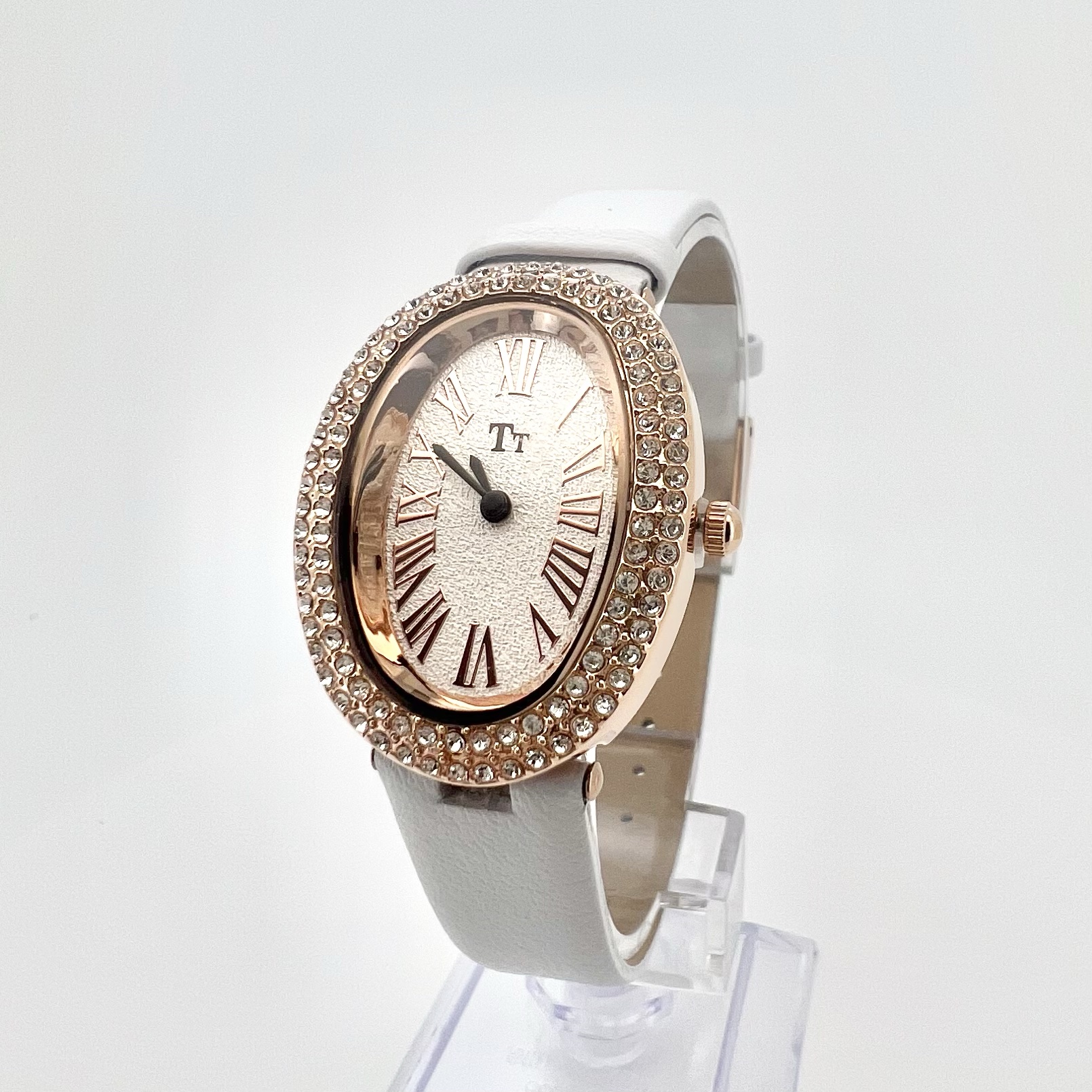 שעון אליפסה עם כיתוב במספרים יוונים משובץ אבני זרקון מסביב לשעון