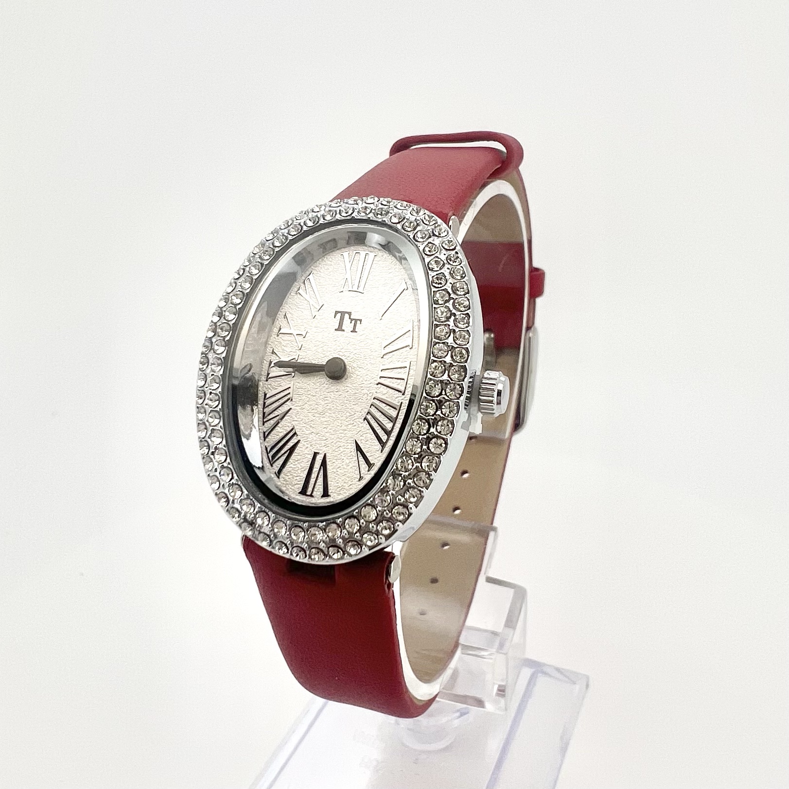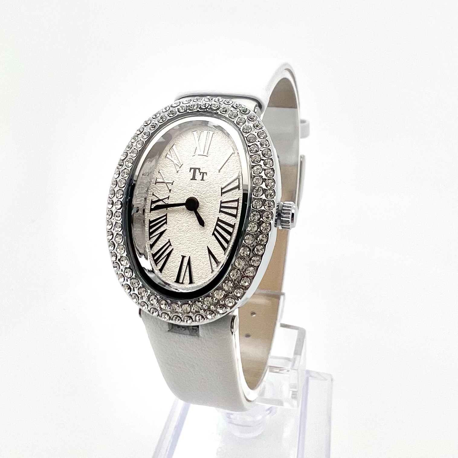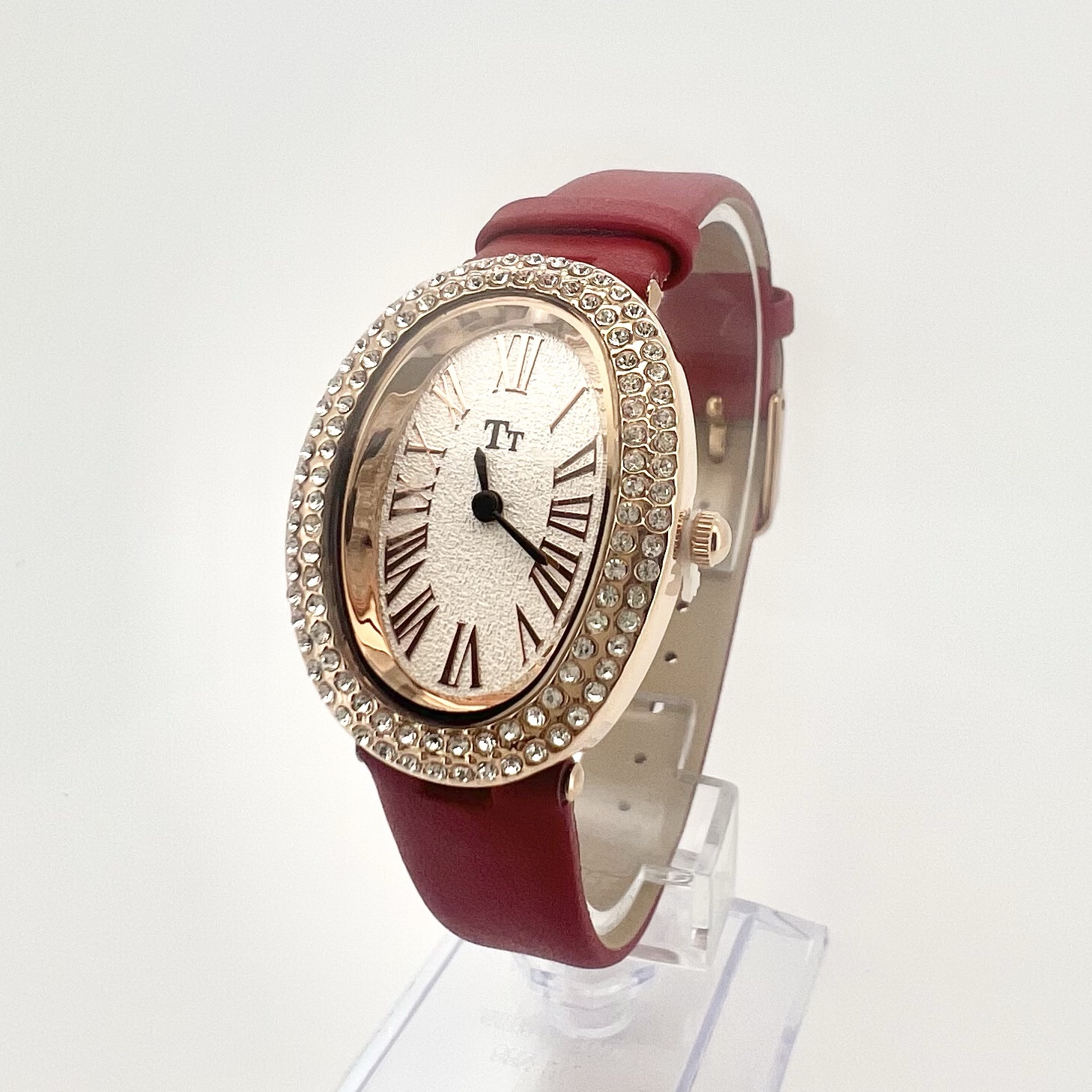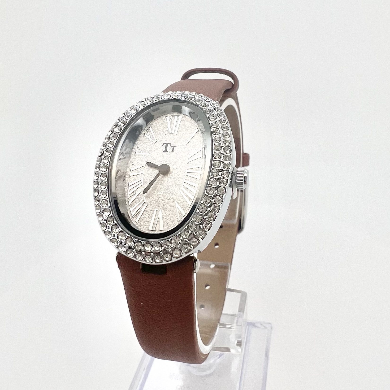 שעון אליפסה עם כיתוב במספרים יוונים משובץ אבני זרקון מסביב לשעון