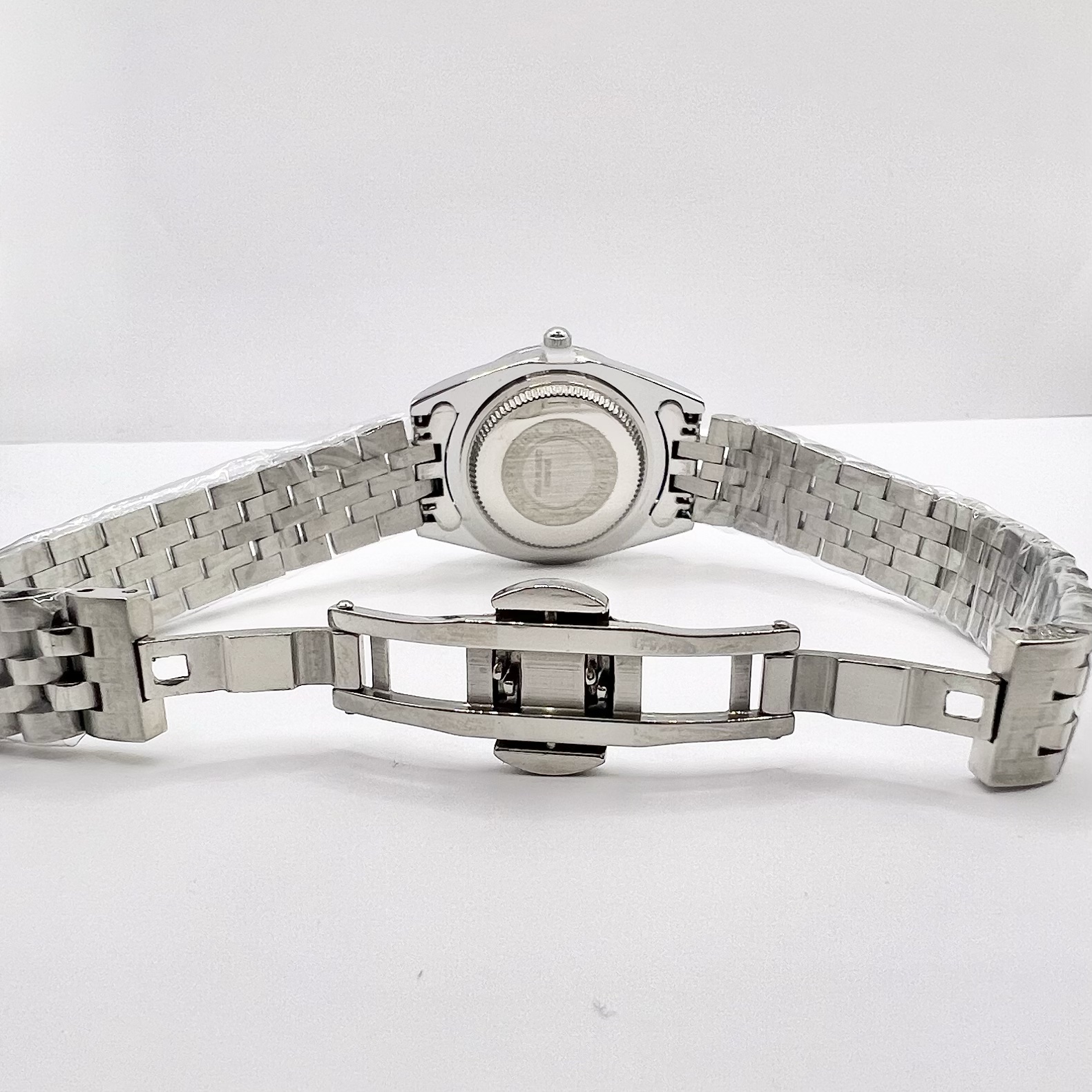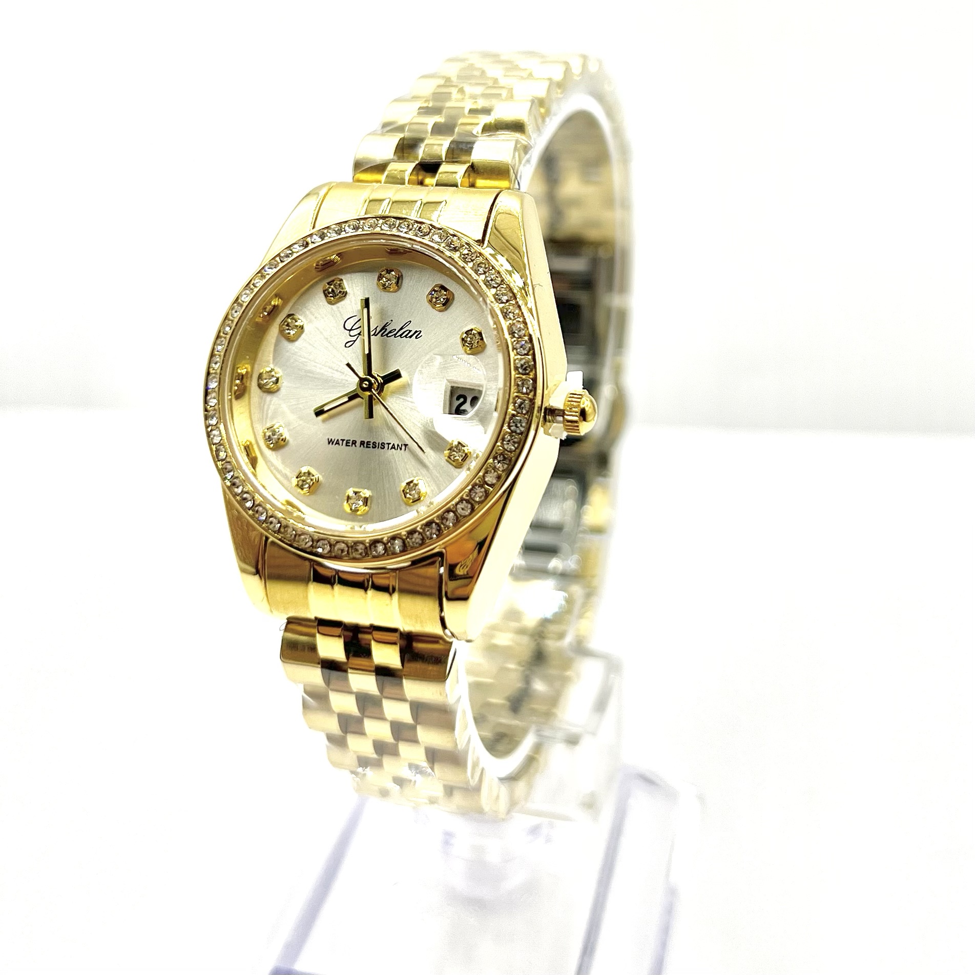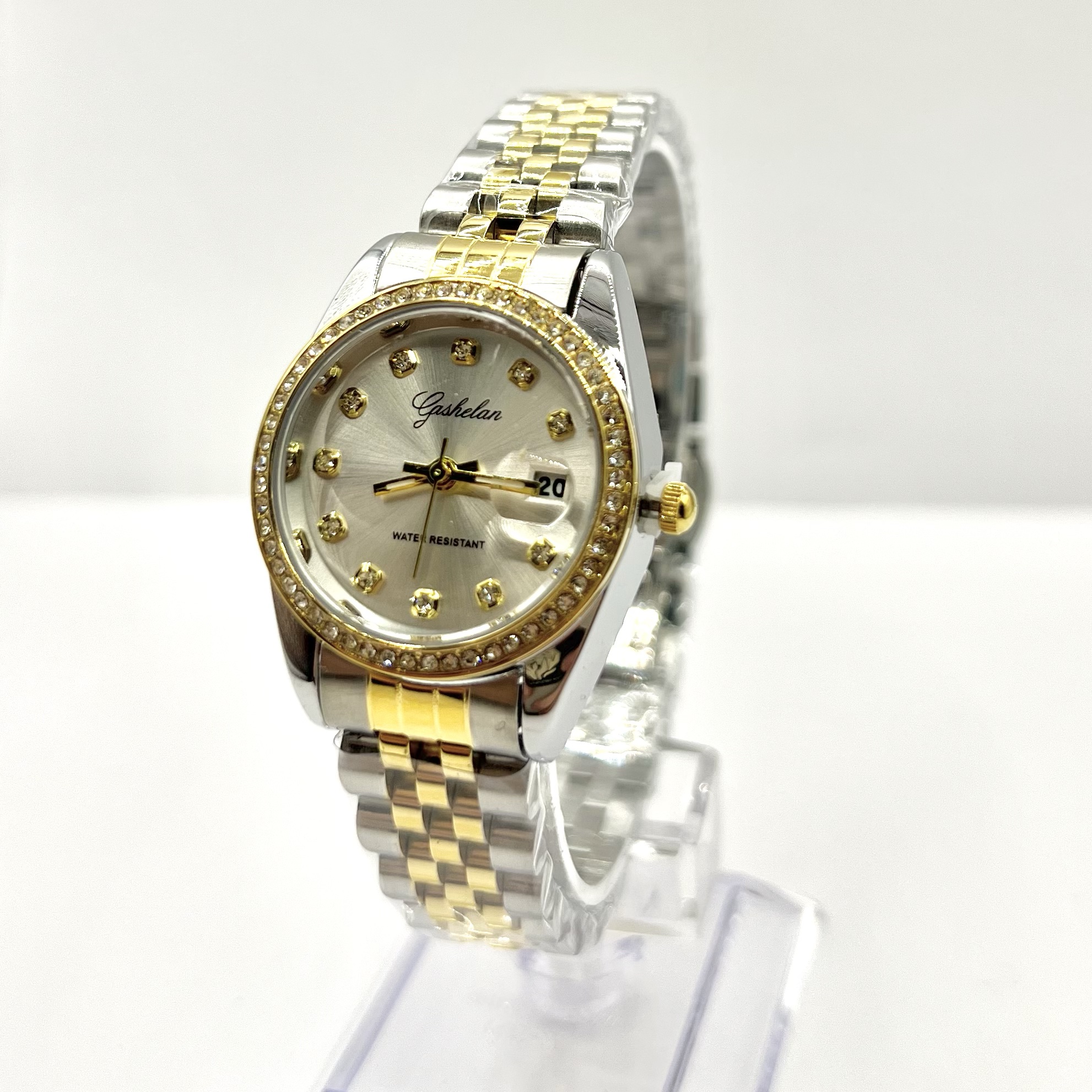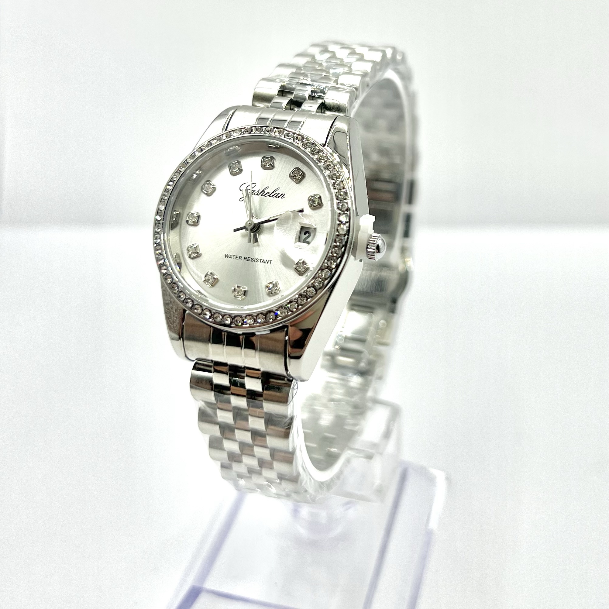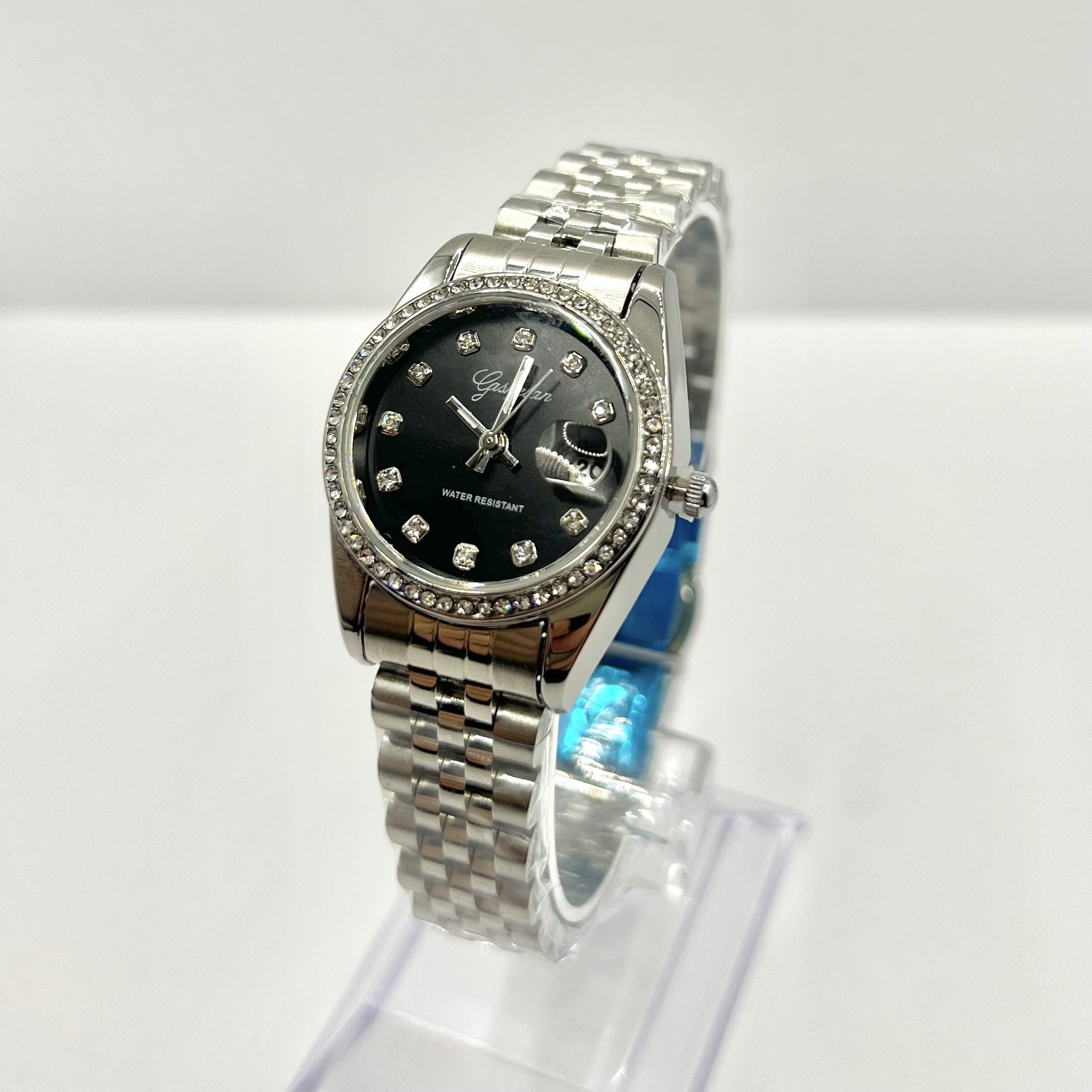 שעון קטן חלק עם לוח במגוון צבעים משובץ אבני זרקון במקום מספרים