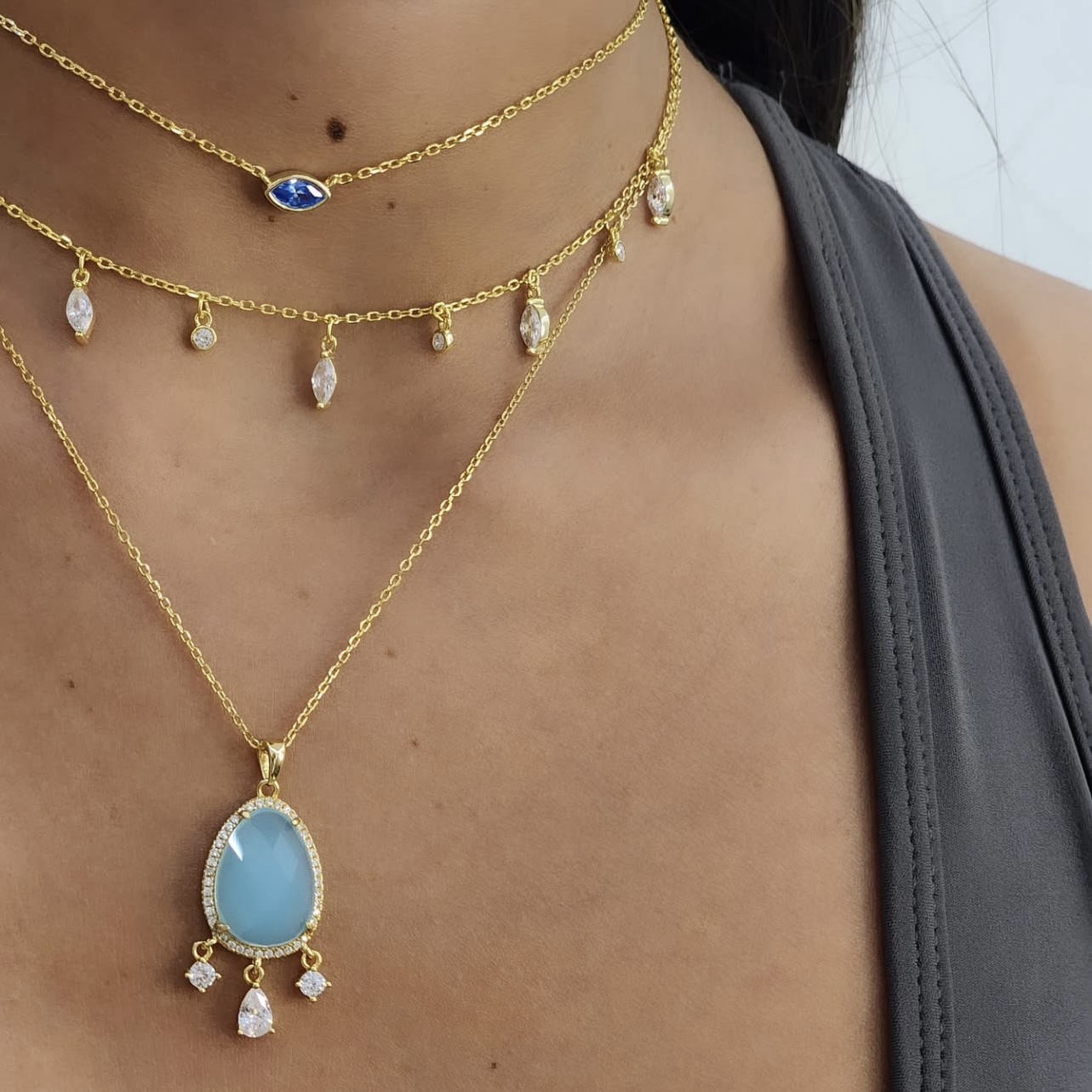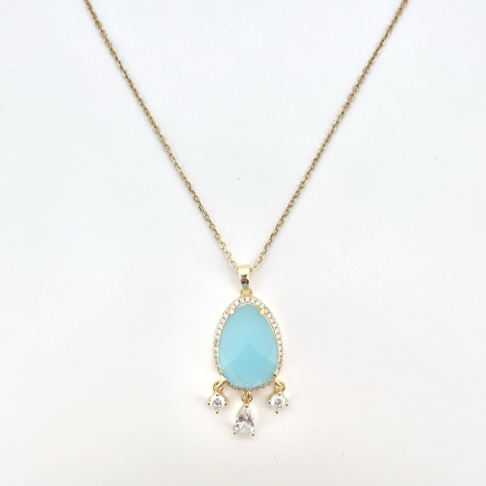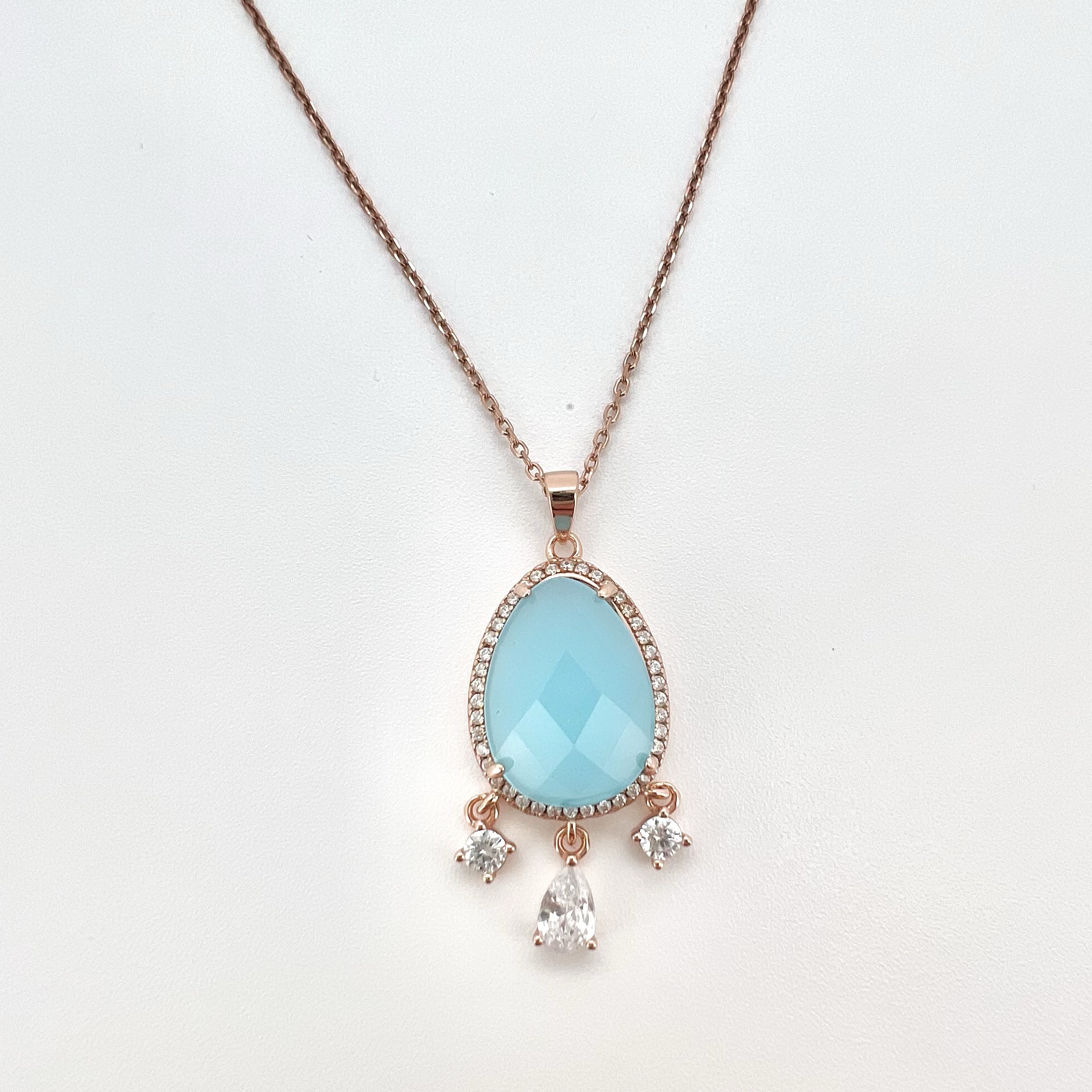 שרשרת עם תליון אבן מקרמה בצבע טורקיז משובצת אבני זרקון מסביב ועוד שלושה אבני זרקון נופלים ממנה
